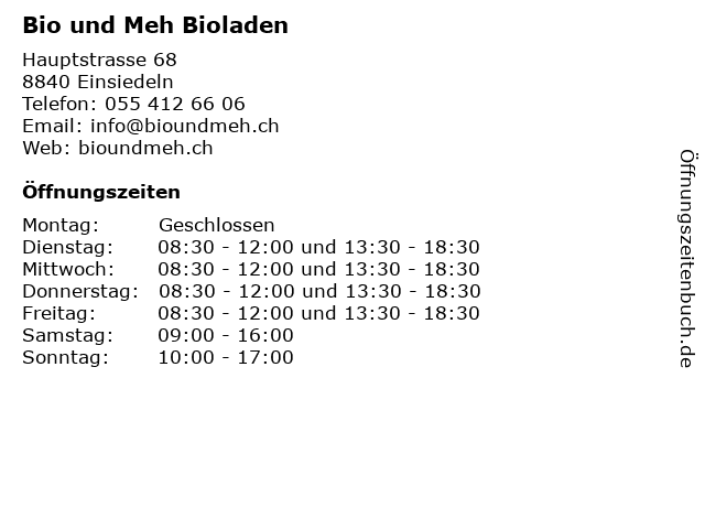 | Öffnungszeiten Bio und Meh Bioladen in Einsiedeln anzeigen | |