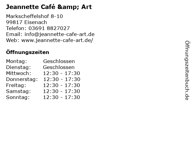 | Öffnungszeiten Jeannette Café & Art in Eisenach anzeigen | |
