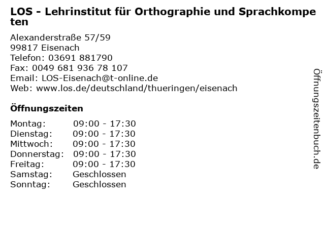 4 LOS - Lehrinstitut für Orthographie und Sprachkompetenz (Entfernung: 45,58 km) Georgstraße 3, 98617 Meiningen 5 Petra Ziethen Praxis für Logopädie und Legasthenie (Entfernung: 48,25 km) Schlüterstr. 4, 99089 Erfurt 6 |