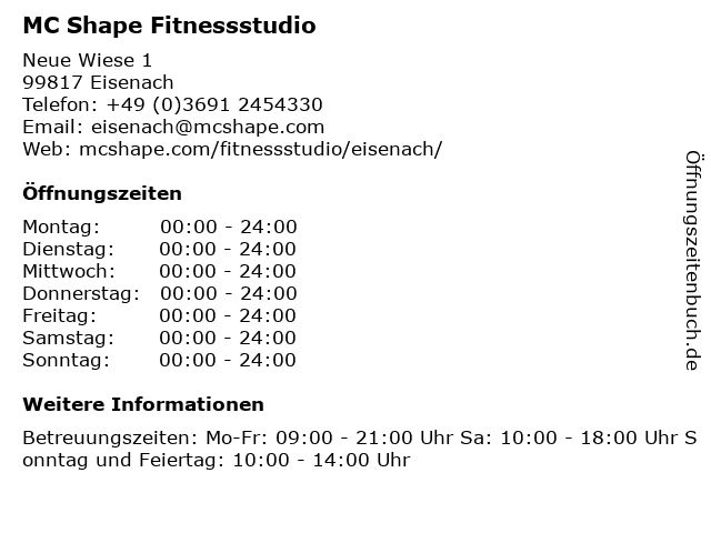 | Öffnungszeiten MC Shape Fitnessstudio in Eisenach anzeigen | |
