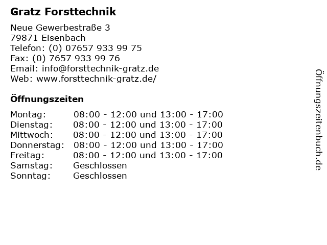 | Öffnungszeiten Gratz Forsttechnik in Eisenbach anzeigen | |
