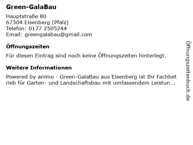 | Öffnungszeiten Green-GalaBau in Eisenberg (Pfalz) anzeigen | |