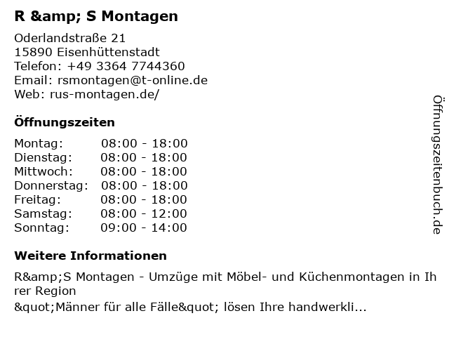 | Öffnungszeiten R & S Montagen in Eisenhüttenstadt anzeigen | |