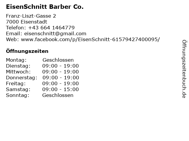 | Öffnungszeiten EisenSchnitt Barber Co. in Eisenstadt anzeigen | |