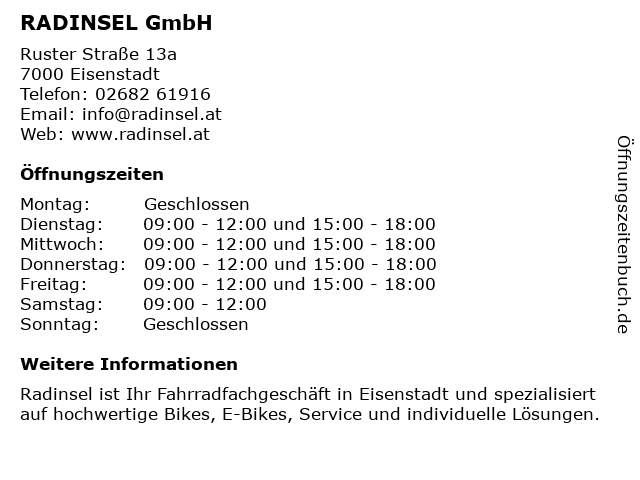 | Öffnungszeiten RADINSEL GmbH in Eisenstadt anzeigen | |
