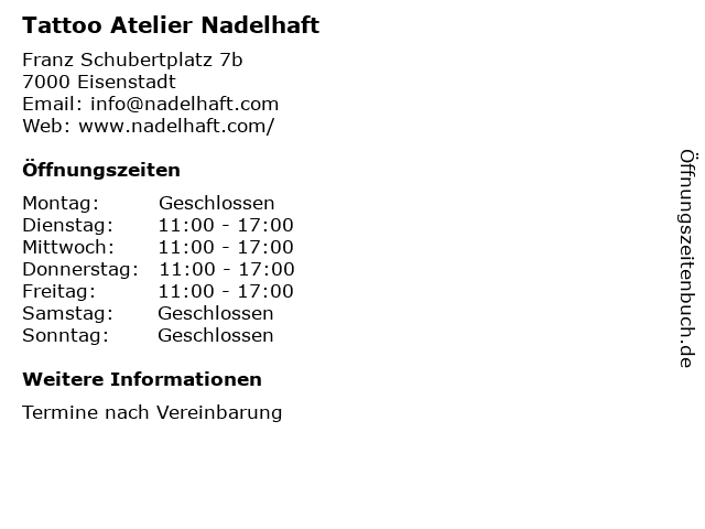 | Öffnungszeiten Tattoo Atelier Nadelhaft in Eisenstadt anzeigen | |