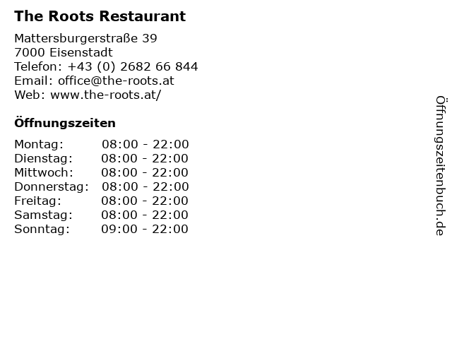 | Öffnungszeiten The Roots Restaurant in Eisenstadt anzeigen | |
