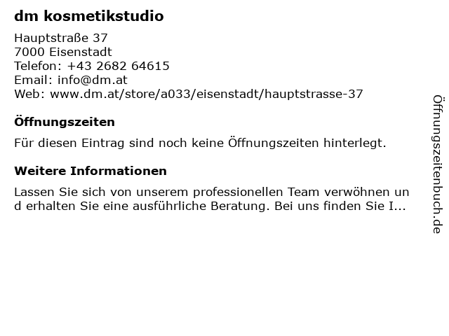 | Öffnungszeiten dm kosmetikstudio in Eisenstadt anzeigen | |