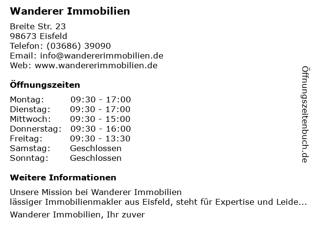 | Öffnungszeiten Wanderer Immobilien in Eisfeld anzeigen | |