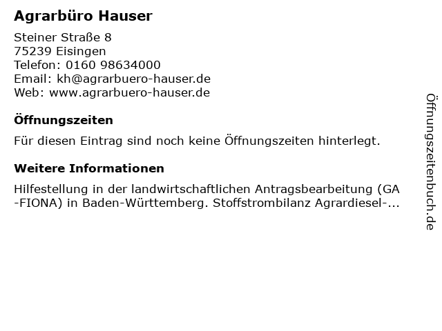 | Öffnungszeiten Agrarbüro Hauser in Eisingen anzeigen | |
