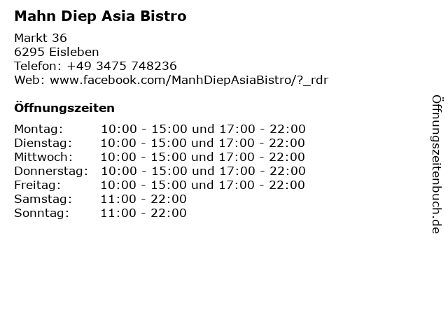 | Telefonnummer Mahn Diep Asia Bistro in Eisleben (+49 3475 748236) anrufen | |