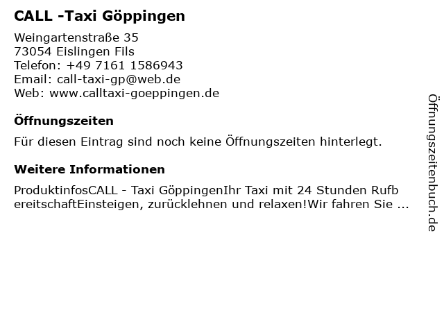Öffnungszeiten CALL -Taxi Göppingen in Eislingen Fils anzeigen | |