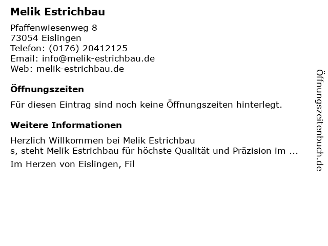 | Öffnungszeiten Melik Estrichbau in Eislingen anzeigen | |