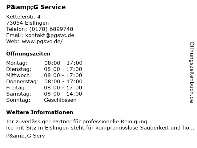 | Öffnungszeiten P&G Service in Eislingen anzeigen | |