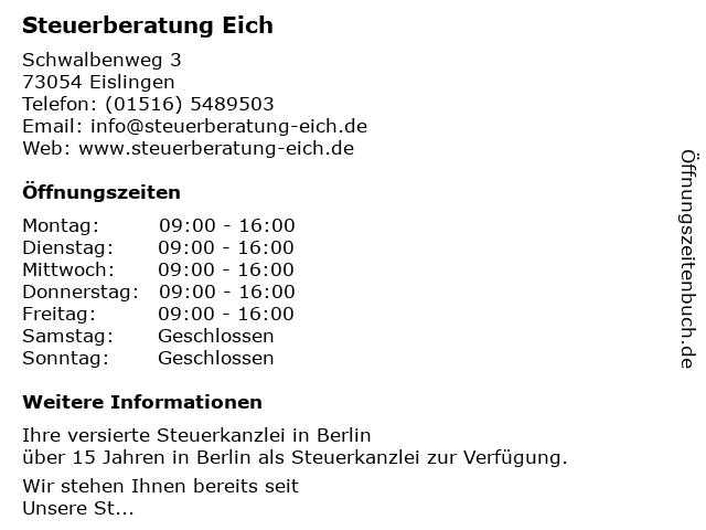 | Öffnungszeiten Steuerberatung Eich in Eislingen anzeigen | |