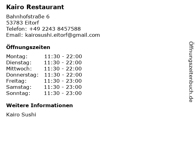 | Öffnungszeiten Kairo Restaurant in Eitorf anzeigen | |