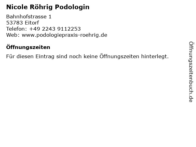 | Öffnungszeiten Nicole Röhrig Podologin in Eitorf anzeigen | |