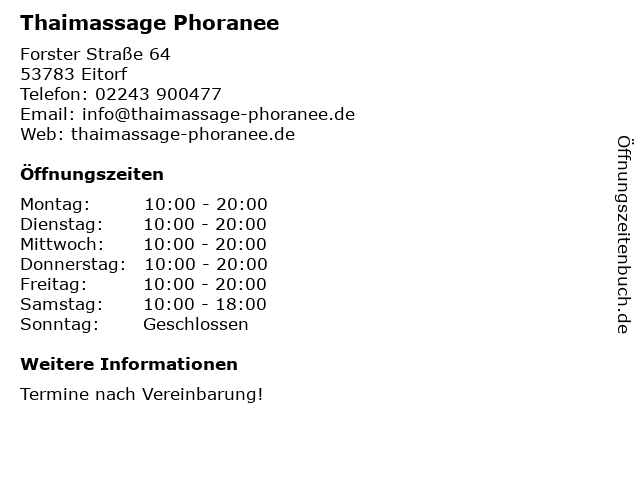 | Öffnungszeiten Thaimassage Phoranee in Eitorf anzeigen | |