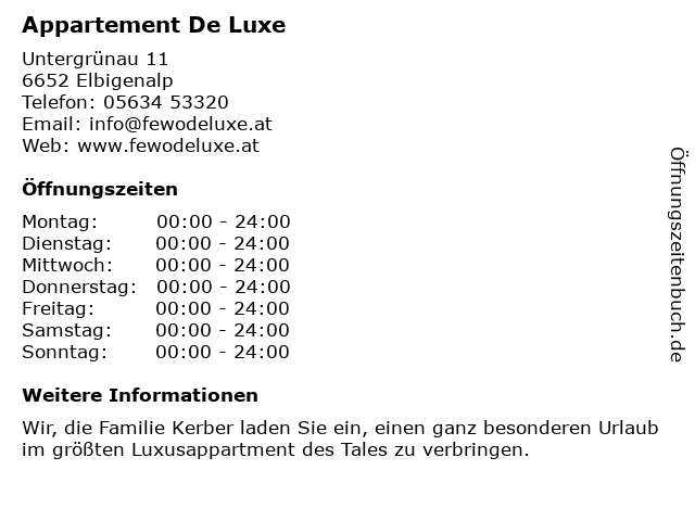 | Öffnungszeiten Appartement De Luxe in Elbigenalp anzeigen | |