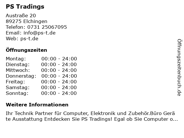 | Öffnungszeiten PS Tradings in Elchingen anzeigen | |