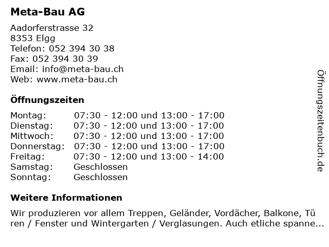 | Öffnungszeiten Meta-Bau AG in Elgg anzeigen | |