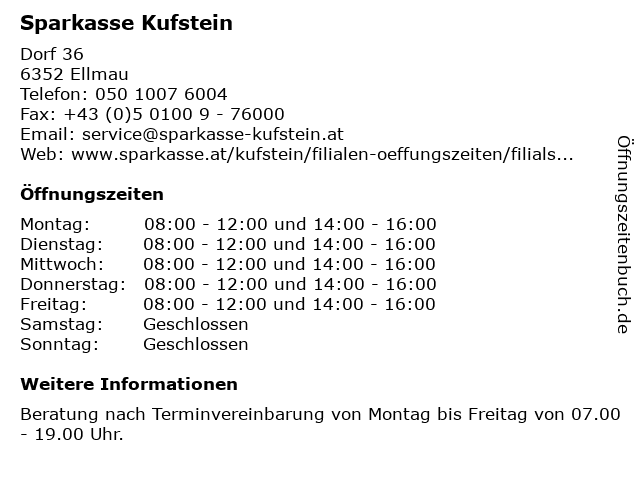 | Öffnungszeiten Sparkasse Kufstein in Ellmau anzeigen | |