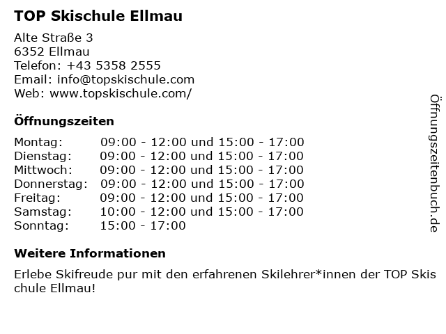 | Öffnungszeiten TOP Skischule Ellmau in Ellmau anzeigen | |