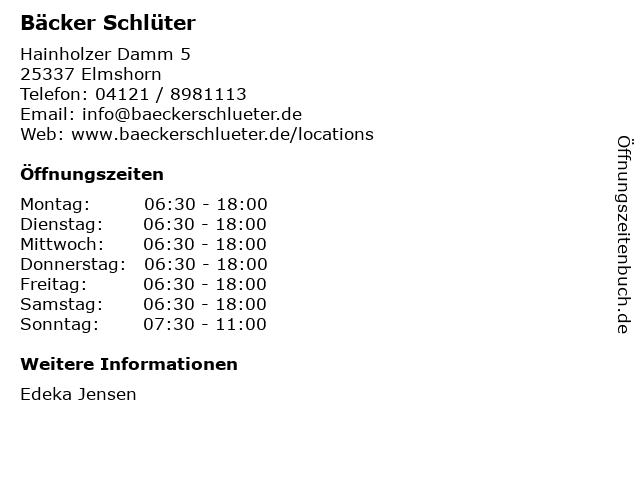 | Öffnungszeiten Bäcker Schlüter in Elmshorn anzeigen | |