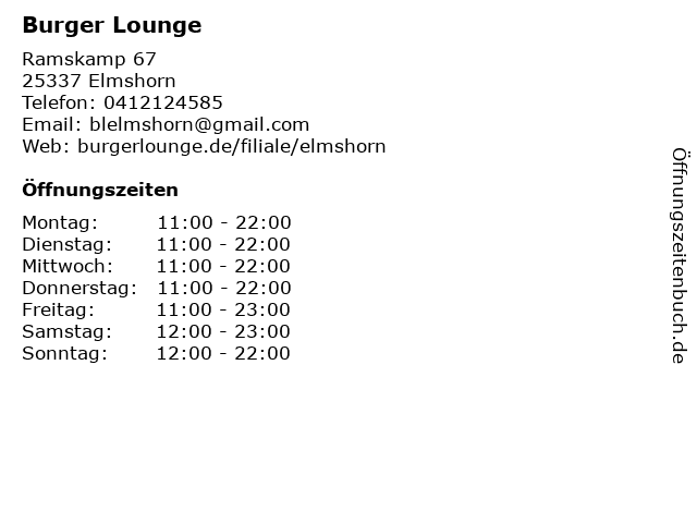 | Öffnungszeiten Burger Lounge in Elmshorn anzeigen | |