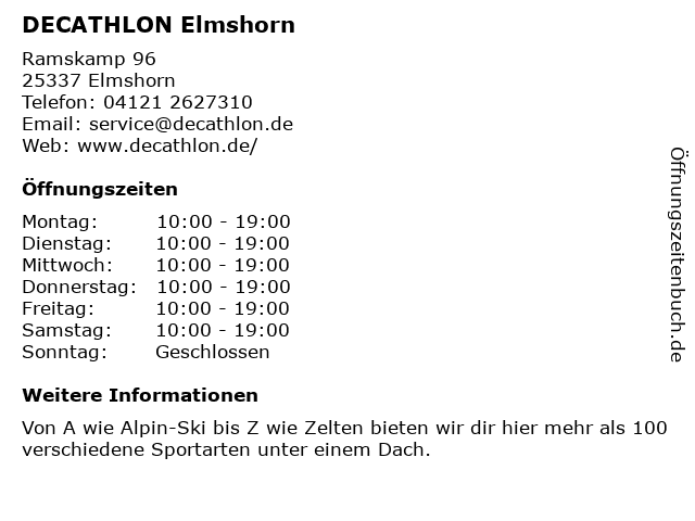 | Öffnungszeiten DECATHLON Elmshorn in Elmshorn anzeigen | |