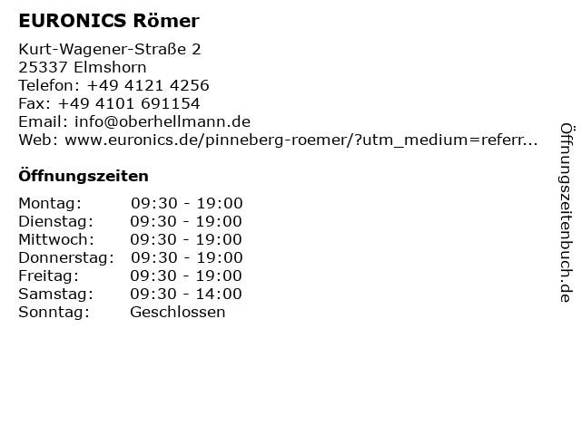 | Öffnungszeiten EURONICS Römer in Elmshorn anzeigen | |