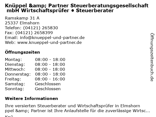 1 Dr. Bernd Langhein Steuerberater und Wirtschaftsprüfer (Entfernung: 0,36 km) Mildred-Scheel-Weg 16, 25337 Elmshorn 2 3 Ehler Ermer & Partner Wirtschaftsprüfer, vereidigter Buchprüfer, Steuerberater, Rechtsanwälte (Entfernung: 0,99 km) Ramskamp 71-75, 25337 Elmshorn 5 SHBB Steuerberatungsgesellschaft mbH, Kanzlei Elmshorn (Entfernung: 1,88 km) Lieth 2 d, 25336 Elmshorn 6 Herbert Stegemann Steuerberater und Wirtschaftsprüfer (Entfernung: 2,12 km) Ollnsstr. 141, 25336 Elmshorn |