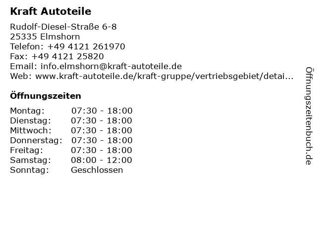| Öffnungszeiten Kraft Autoteile in Elmshorn anzeigen | |