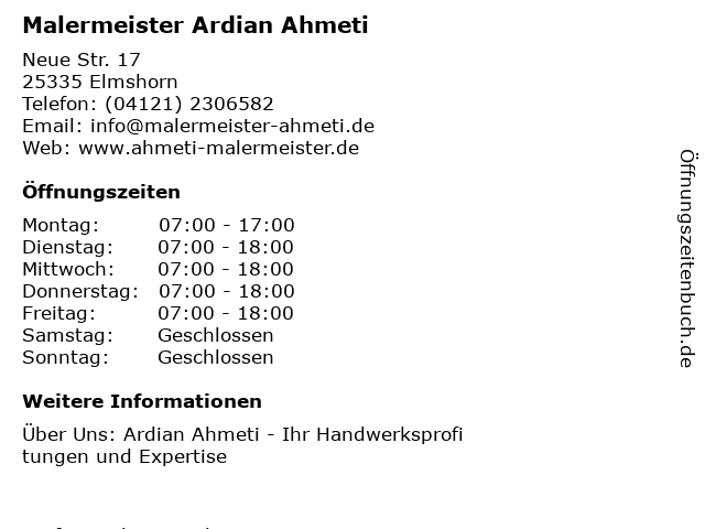 | Öffnungszeiten Malermeister Ardian Ahmeti in Elmshorn anzeigen | |