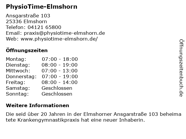 | Öffnungszeiten PhysioTime-Elmshorn in Elmshorn anzeigen | |