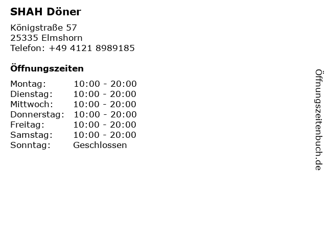 | Öffnungszeiten SHAH Döner in Elmshorn anzeigen | |