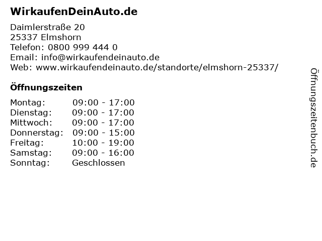 | Öffnungszeiten WirkaufenDeinAuto.de in Elmshorn anzeigen | |
