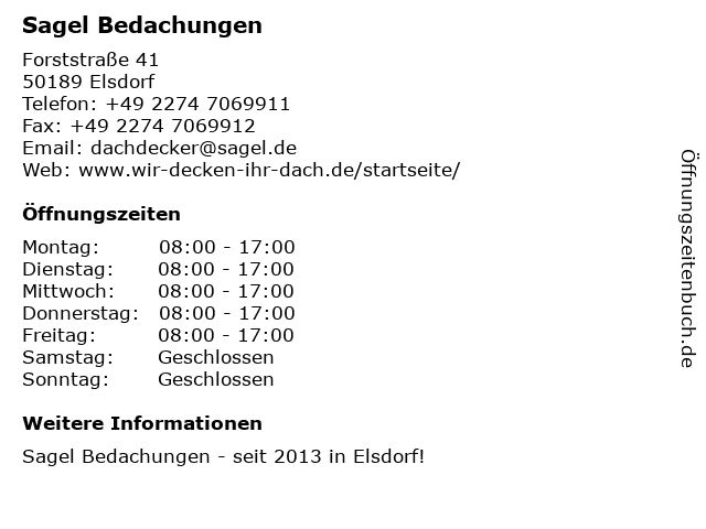 | Öffnungszeiten Sagel Bedachungen in Elsdorf anzeigen | |