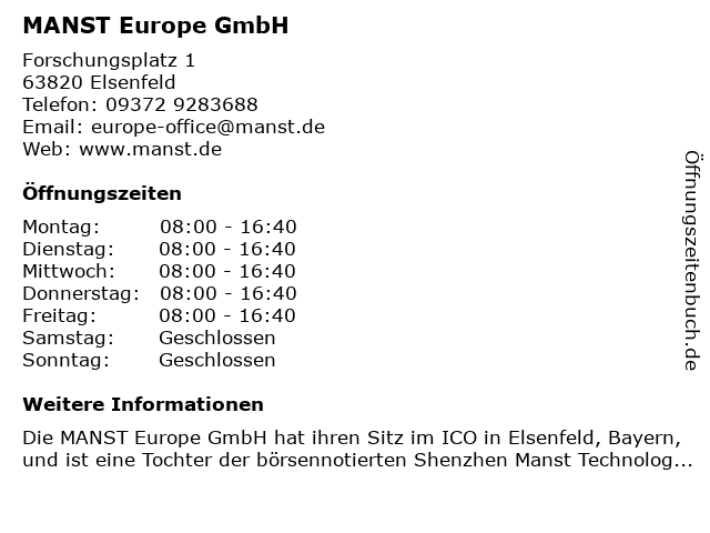 | Öffnungszeiten MANST Europe GmbH in Elsenfeld anzeigen | |