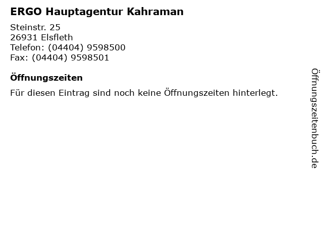 | Öffnungszeiten ERGO Hauptagentur Kahraman in Elsfleth anzeigen | |