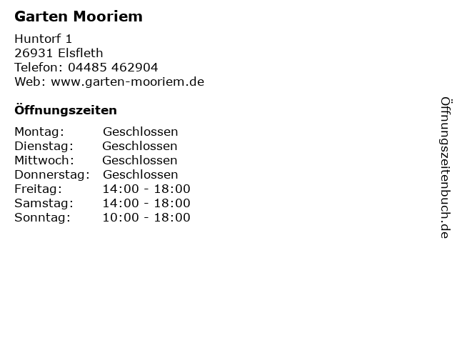 | Öffnungszeiten Garten Mooriem in Elsfleth anzeigen | |