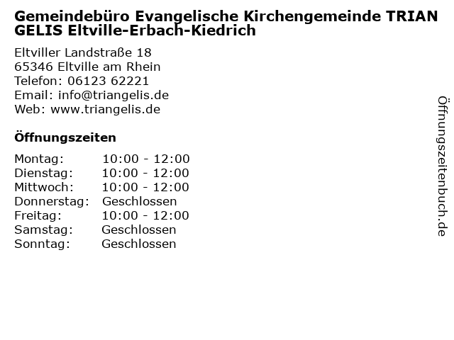 Branchen & Suchbegriffe zu Gemeindebüro Evangelische Kirchengemeinde TRIANGELIS Eltville-Erbach-Kiedrich:erbach, evangelische, gemeindebüro, kiedrich, kirchengemeinde, triangelis |