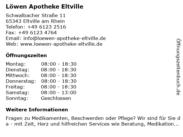 1 LÖWEN APOTHEKE - Apothekerin Susanne Mainka (Entfernung: 0,01 km) Schwalbacherstr. 11, 65343 Eltville 6 |