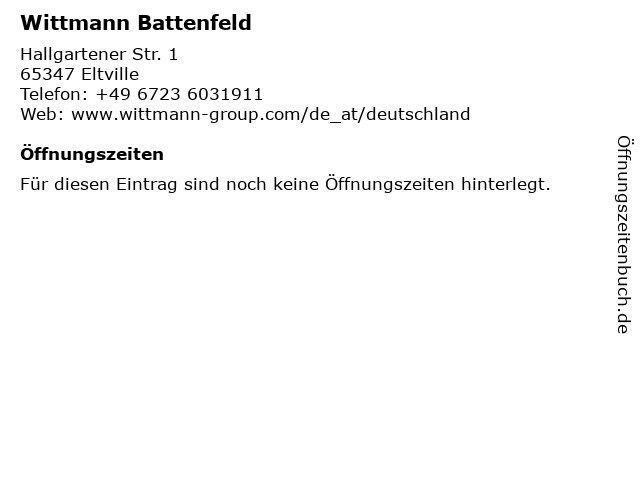 | Öffnungszeiten Wittmann Battenfeld in Eltville anzeigen | |