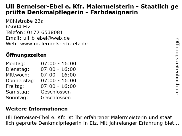 Branchen & Suchbegriffe zu Uli Berneiser-Ebel e. Kfr. Malermeisterin - Staatlich geprüfte Denkmalpflegerin - Farbdesignerin:berneiser, denkmalpflegerin, e., ebel, farbdesignerin, geprüfte, kfr., malermeisterin, staatlich, uli |