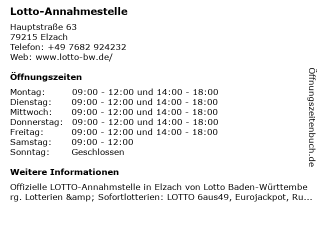 | Öffnungszeiten Lotto-Annahmestelle in Elzach anzeigen | |
