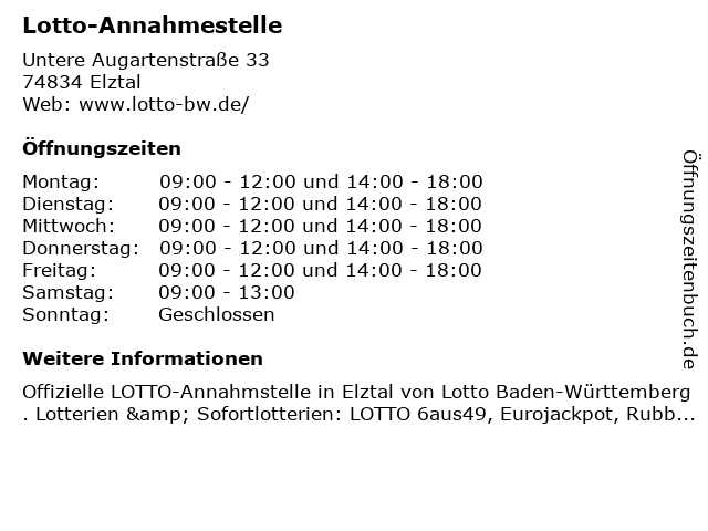 | Öffnungszeiten Lotto-Annahmestelle in Elztal anzeigen | |