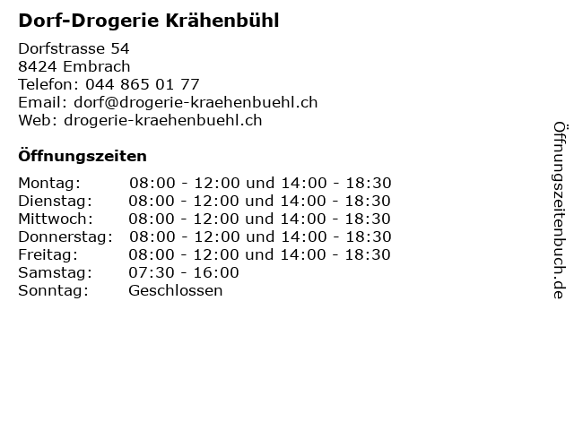 | Öffnungszeiten Dorf-Drogerie Krähenbühl in Embrach anzeigen | |