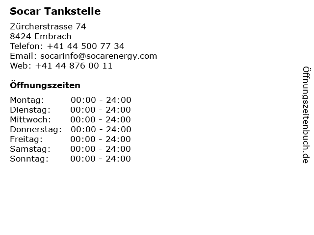 | Öffnungszeiten Socar Tankstelle in Embrach anzeigen | |