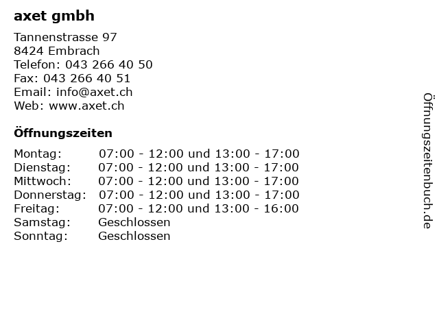 | Öffnungszeiten axet gmbh in Embrach anzeigen | |